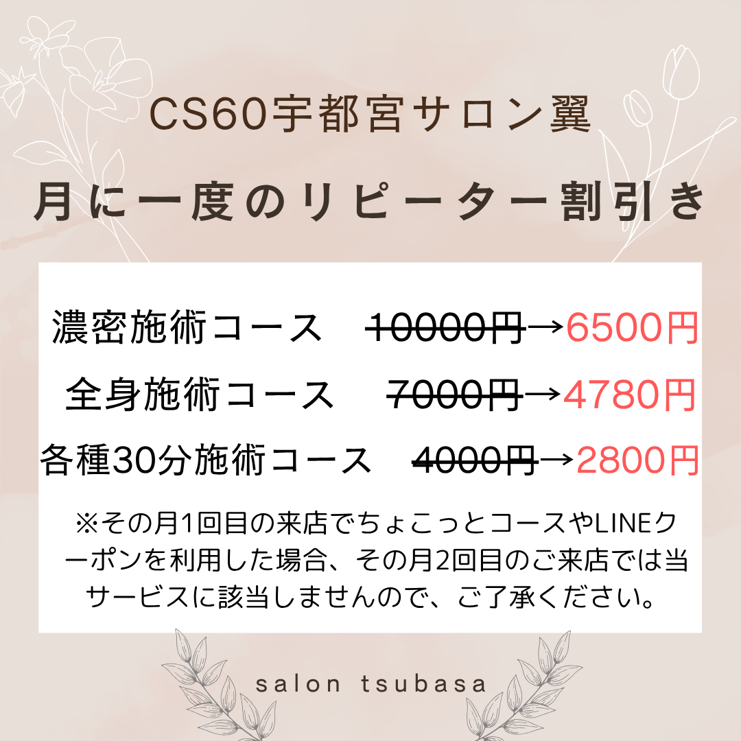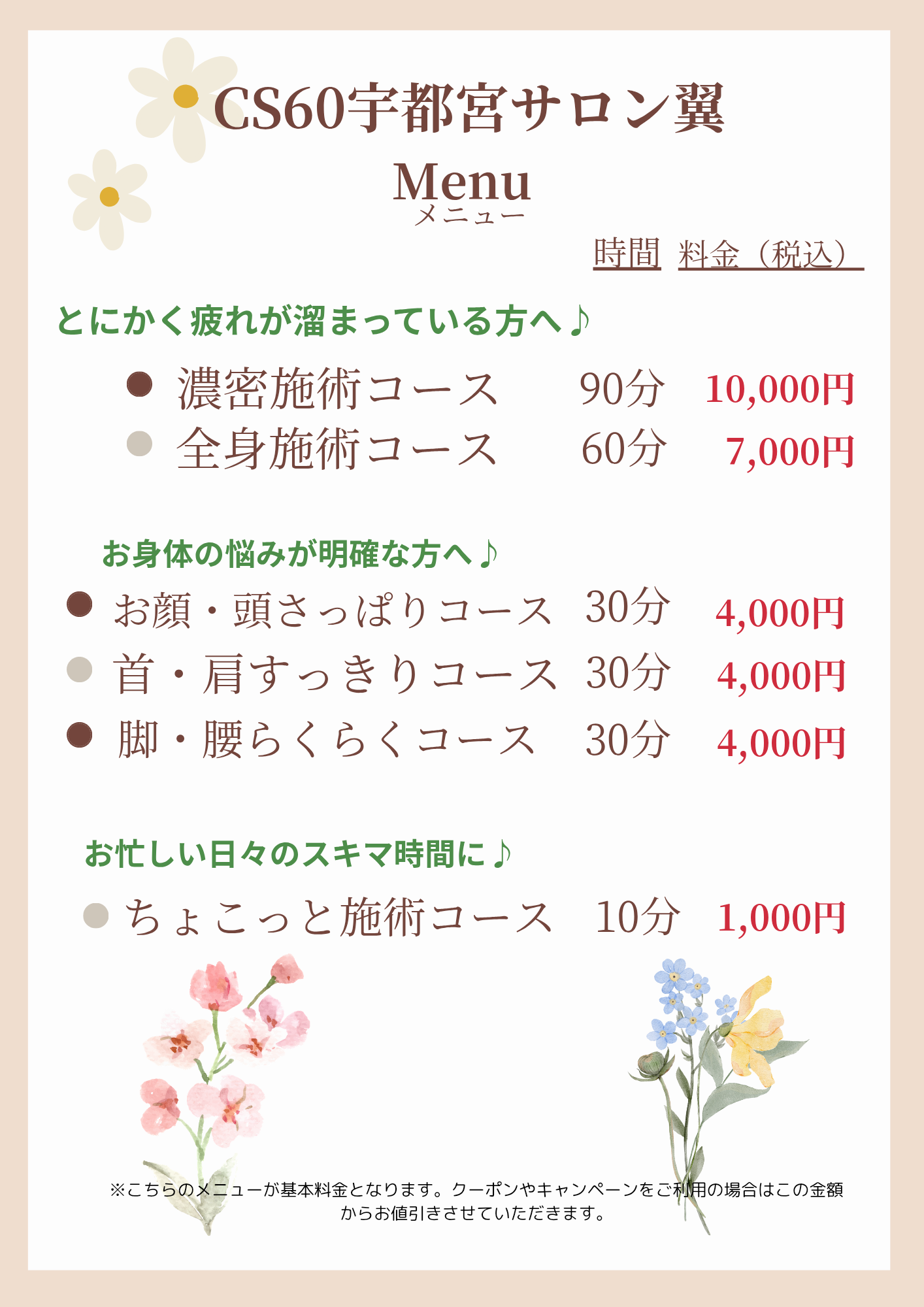基本的な施術は全身施術コースと同じですが、時間の長いコースとなっているので、お客様のお話をよく聞き、多くの要望に答えながら施術をさせていただくコースとなっております。