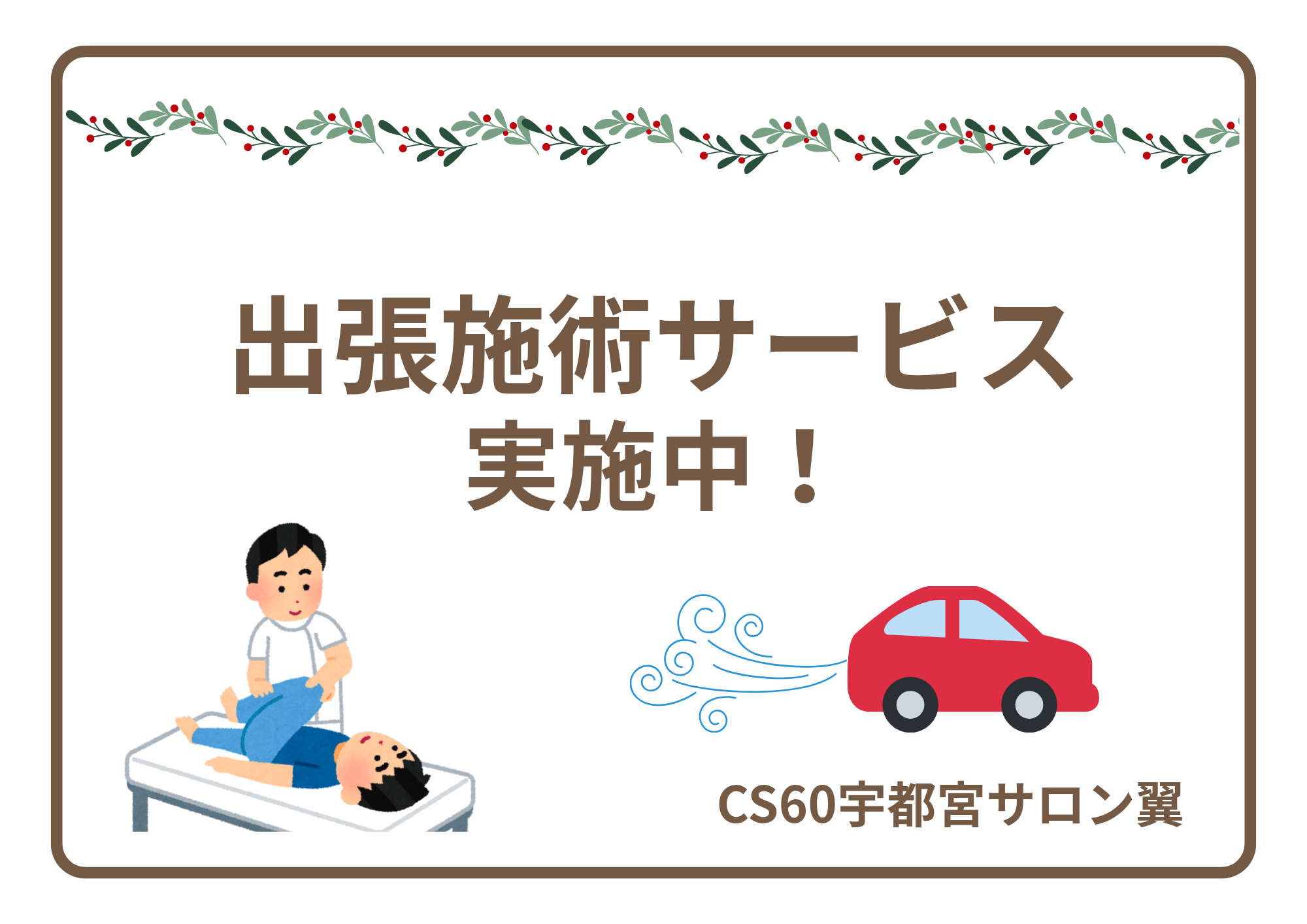 出張施術は全営業日対応しております。出張範囲につきましては宇都宮市内周辺とさせていただきます。