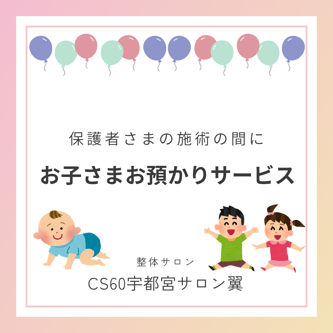 。保護者様を施術している間にお子さまを預かり、お世話をいたします。予約の際にお子さまがいるという旨を伝えていただけると助かります。